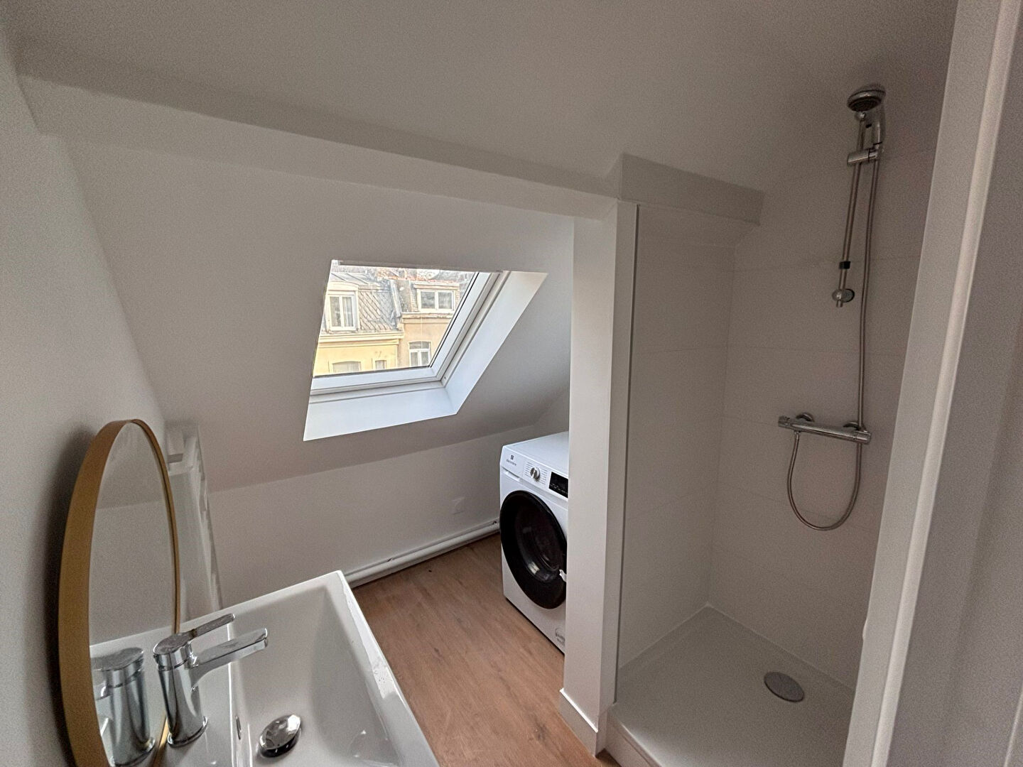 – d’une salle de bains moderne avec douche et lave-linge séchant